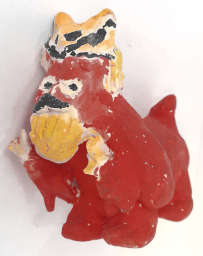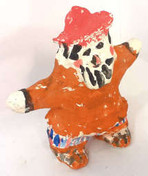 Это старооскольская игрушка. К ней была пара-женщина, слепленная другим человеком. У меня её нет, фотографии тоже. Это было в эпоху до повсеместных цифровых камер. Они стояли на городской выставке в разделе детского творчества. Старооскольская игрушка традиционно делалась из белой глины, а у нас была только красная. Сейчас я бы покрасил без оранжевого и коричневого.