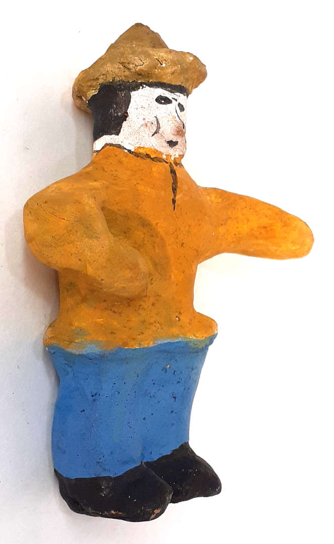 Это старооскольская игрушка. К ней была пара-женщина, слепленная другим человеком. У меня её нет, фотографии тоже. Это было в эпоху до повсеместных цифровых камер. Они стояли на городской выставке в разделе детского творчества. Старооскольская игрушка традиционно делалась из белой глины, а у нас была только красная. Сейчас я бы покрасил без оранжевого и коричневого.